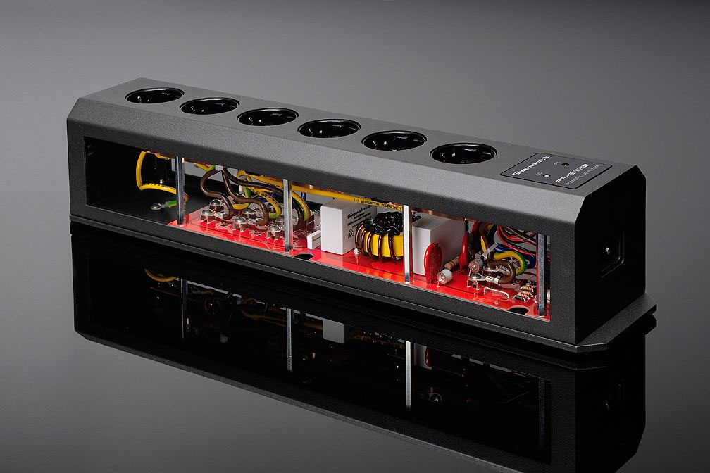 Die PF-2 EVO+ Sockelleiste ist aus hochwertigen Komponenten gefertigt. Ein filternder RLC-Block ist für die Entstörung zuständig. Sie wurde auf einem.in. o metallisierte Polyesterkondensatoren mit niedriger Induktivität und o IP-Filterkern (Eisenpulver). Alle Filterkomponenten sind mit Silberlot auf einer massiven doppelseitigen Leiterplatte mit sehr großen Querschnitten montiert.