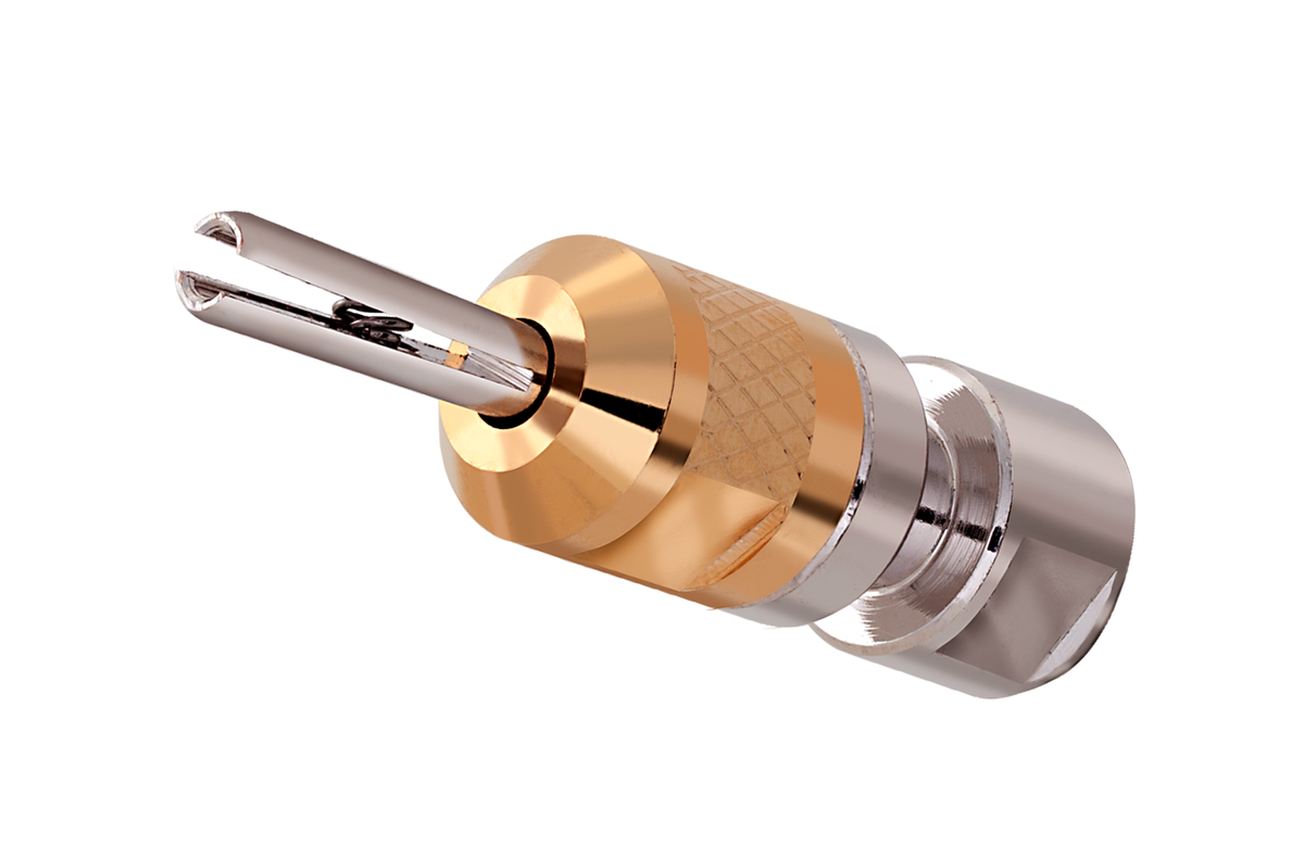 Goldbeschichtete Mutter zum Befestigen von Flachsteckern oder blanken Drähten. Konisches Loch auf der Rückseite zum Löten von Drähten oder zum Stapeln zusätzlicher Bananenstecker. Federbelastete geteilte Spitze für maximale Kontaktfläche und Haltekraft.